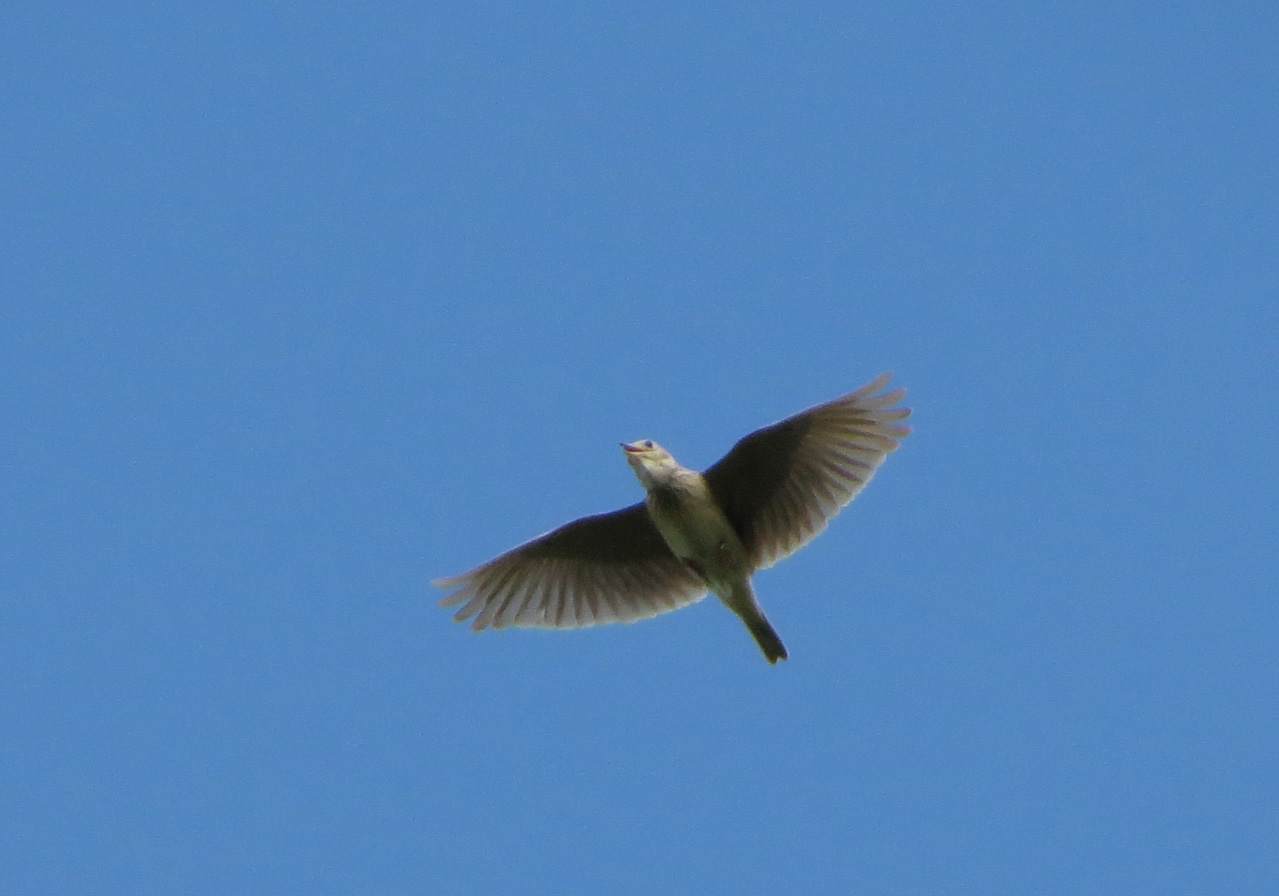 Oriental Skylark shows distinct jizz during song-flight: Broad-winged, short-tailed and “CLOSED-tailed” – quite different from e.g. Common Skylark and similar the jizz of the Woodlark.