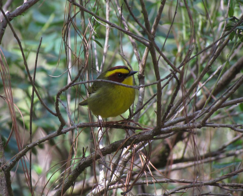 Beskrivelse: Den gule øjenbrynsstribe kan virke næsten flourescerende i underskovens halvmørke.