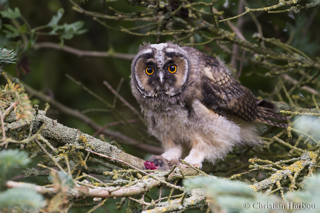 Beskrivelse: Den voksne ugle har netop afleveret en stor, fed markmus med hovedet behørigt bidt af. Ungen, der er ganske upåvirket af mit kamera, fortærede først indvolde og slugte derefter resten i en mundfuld. Billedet er taget klokken ca. 9 om aftenen på iso 2.500