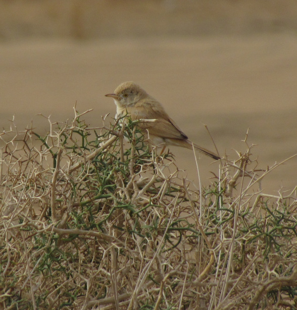 Selv om bevoksningen var sparsom, kunne fuglene let forsvinde i perioder, hvor de søgte føde inde i tuerne, men udover enkelte syngende Hærfuglelærker og overflyvende Plettede Sandhøns, var Ørkensangerens sang, den eneste som brød stilheden.