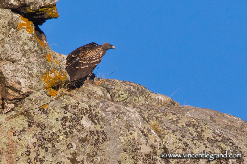 Beskrivelse: Bird still at first light on the southern cliff with a Griffon Vulture. Smaller than Griffon Vulture with cold tones, the adult are easy to catch in a group of Vultures.