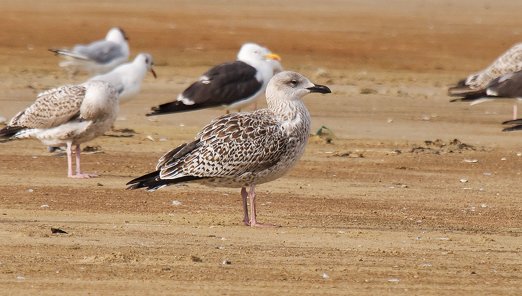 Beskrivelse: Denne kraftkarl af en Middelhavsmåge opdagede jeg først blandt de mange andre måger af forskellige arter pga. dens størrelse. Fuglen var en kæmpe Sølvmåge faktisk på størrelse med de Svartbage der stod i nærheden. Jeg så hurtigt det flotte regelmæssige mønster på rygfjerene og tjeckede straks tertiærerne for at se om de også var på plads. Det var de sørme og jeg begyndte at knipse løs. Andre kendetegn som er på plads for en 1k Middelhavsmåge: Hvid bug, ensfarvet mørk overvinge med begrænset spejl, øjenmaske, hvid overhale, kraftigt kort næb. Han pga. størrelsen.