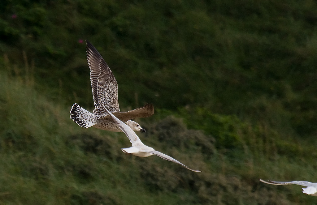 Beskrivelse: Denne kraftkarl af en Middelhavsmåge opdagede jeg først blandt de mange andre måger af forskellige arter pga. dens størrelse. Fuglen var en kæmpe Sølvmåge faktisk på størrelse med de Svartbage der stod i nærheden. Jeg så hurtigt det flotte regelmæssige mønster på rygfjerene og tjeckede straks tertiærerne for at se om de også var på plads. Det var de sørme og jeg begyndte at knipse løs. Andre kendetegn som er på plads for en 1k Middelhavsmåge: Hvid bug, ensfarvet mørk overvinge med begrænset spejl, øjenmaske, hvid overhale, kraftigt kort næb. Han pga. størrelsen.