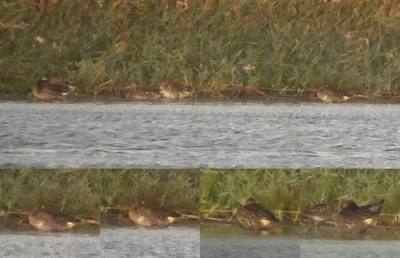 Beskrivelse: Denne fugl faldt i øjnene i striben af rastende Krikænder - alle i eclipse/hun/ungfugledragter. Jeg tænker: Det må være en han med den undergump (i eclipsedragt) - men med så pragtdragtagtig undergump, er det måske en overgangsdragt? Den lodrette hvidlige stribe sidder rigtigt for Amerikansk og er bred og tydelig og pænt lang - men jeg kan ikke finde vidnesbyrd om at den er en del af eclipsedragten???