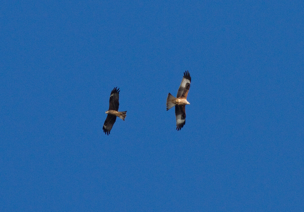 billedet er taget netop i det øjeblik hvor de to fugle passerede hinanden mens de kredsede i cirkler på måske 50 m,og andre billeder fra sekvensen viser normal mere sammenfoldet hale med kløft, kan være en højdejusterings manøvre for at sikre passage i sikkerhedsafstand der fik den røde glente til at folde halen helt ud et kort øjeblik !