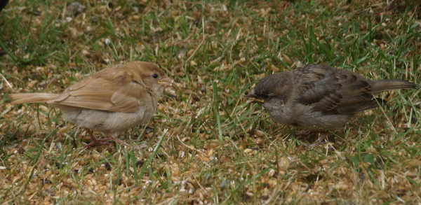 Beskrivelse: Billedet er taget gennem en rude. Havde 2 leucistiske Gråspurve i haven. En han Gråspurve og den ene leucistiske fugl fodrede ungerne, hvor af den ene også var leucistisk. Formoder derfor at de to fejlfarvede er en adult hun og en juvenil hun.