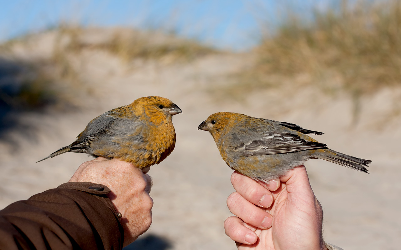 Beskrivelse: Så er krognæbinvasionen for alvor igang i det nordjyske! I dag blev det til mindst 11 fugle i Skagen (3 ringmærket af RoC) og hele 62 sydtrækkende fugle ved Nordmandshage frem til kl 13.05 (PAFR KHK) =ny DK-rekord!
