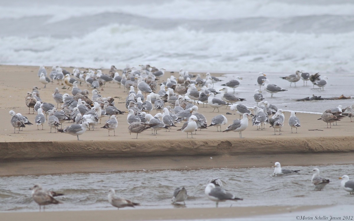 Hej Morten. Jeg glemte at skrive, at jeg mener det er California gulls pga mørkt øje og rundt hoved. Benfarven ser måske lidt sølvmåge-agtig ud, men arten har blege og farveløse ben, lidt som kaspisk måge. Jeg mener der gemmer sig mindst 10-15 Westerns bagved; de er en anelse mørkere end de andre (som graellsii). VH Jan.