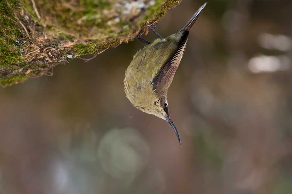 Beskrivelse: Ligesom hos Montane White-eye, har jeg ofte oplevet træløber eller spætmejse-lignende adfærd hos denne art. Fuglene klatrer rundt på stammer og grene mens de fouragerer - i ekstreme tilfælde, som her, med hovedet nedad på bedste spætmejse maner!