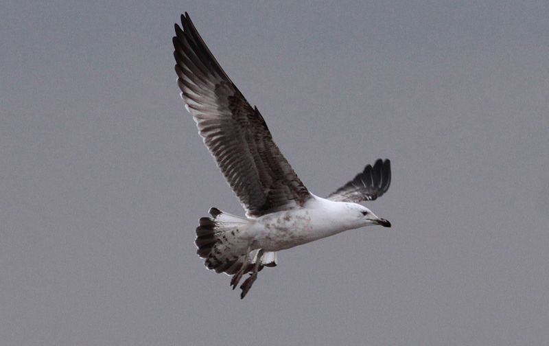 Beskrivelse: 3K Middelhavssølvmåge. Dragten fremstod som meget kontrastrig med mellemgrå ryg imod mørke overvinger, der lignede 2K´ernes, men havde tydeligere lyse inderste håndsvingfjer. Det sorte halebånd var på begge sider meget tydeligt, knaldsort og skarpt afsat fra hvid halerod. Hoved og underkrop overvejende hvid, her ses dog lidt - forvirrende - mørke pletter midt på bugen, der dog må falde ind under den individuelle variation. Benene er grålige, og hos nogle sås et svagt gulligt anstrøg.