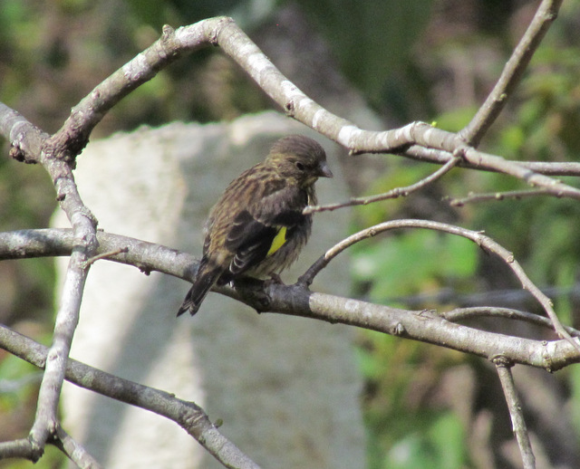 En meget typisk ung Grønirisk-type, med stribet brun fjerdragt og gult vingebånd som det mest iøjnefaldende.