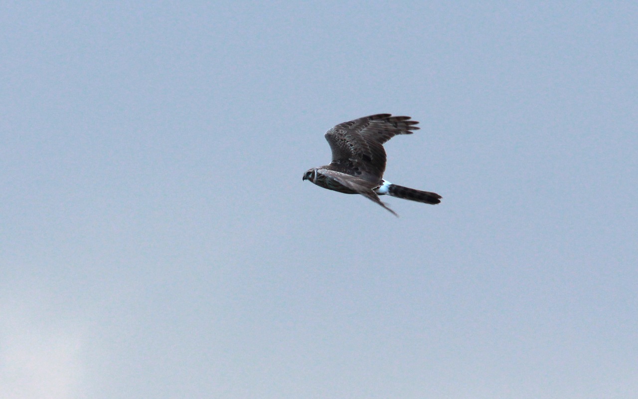 Oversiden af fuglen er kommenteret på andet foto. Overgumpen er her ret bred og renhvid. Dette er reglen hos blå Kærhøg 2k+ hun, der dog godt kan have enkelte mørke striber bagtil. Det kan Steppehøg også, men mere almindeligt er, at Steppehøg har tværbånd i overgumpen, der i så fald er artstypiske hvis andre karakterer stemmer. Sjældnere har Steppehøg renhvid overgump.