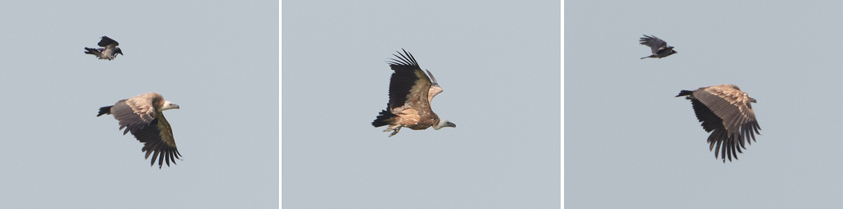 Beskrivelse: Her er 3 billeder skudt i træk, hvor man kan se størelsen på gribben i forhold til Gråkragen.. På det midterste billede er Grå kragen helt væk mellem gribbens vinger!!