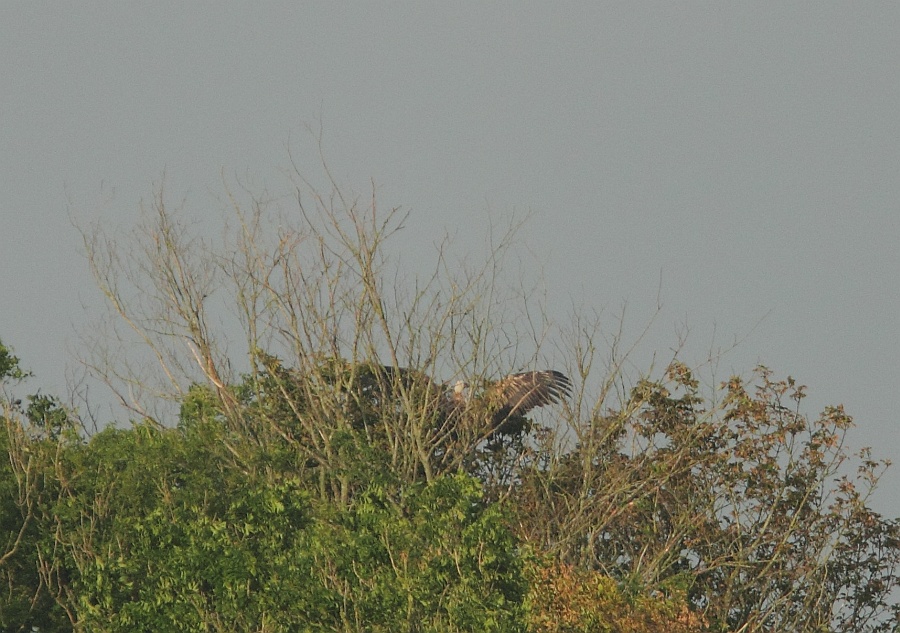 Beskrivelse: Mange morgenfriske twitchere oplevede gåsegribben dukke frem af morgentågen i sit overnatningstræ. Ret hurtigt blev den mobbet af et par krager, men det fik den ikke til at lette. Klokken 6,30 fik den dog trang til at strække vingerne ud i en længere periode.