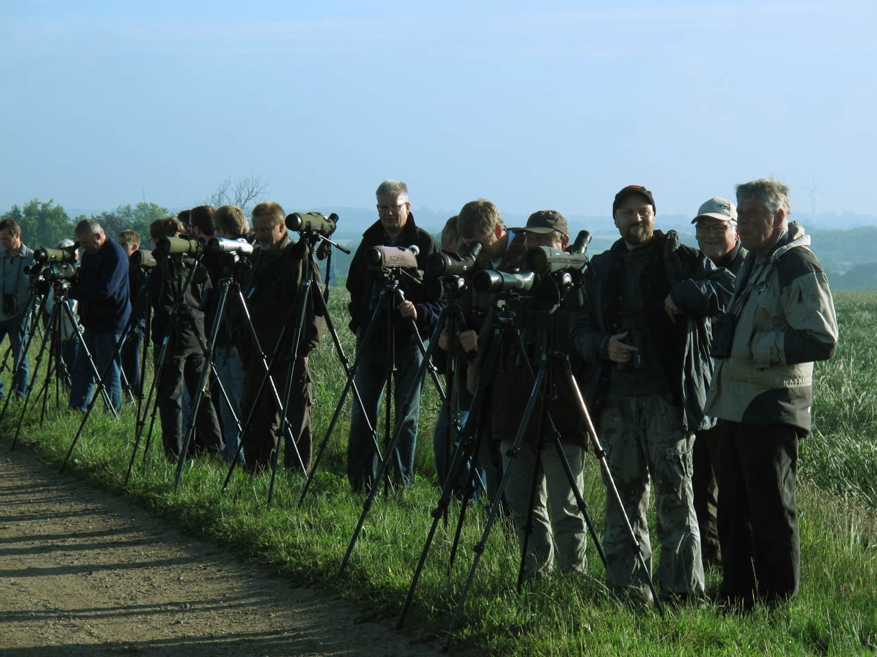 Beskrivelse: op mod 100 fuglekiggere ser på gåsegrib, der har overnattet i toppen af et udgået træ. Først kl. 10. lettede den