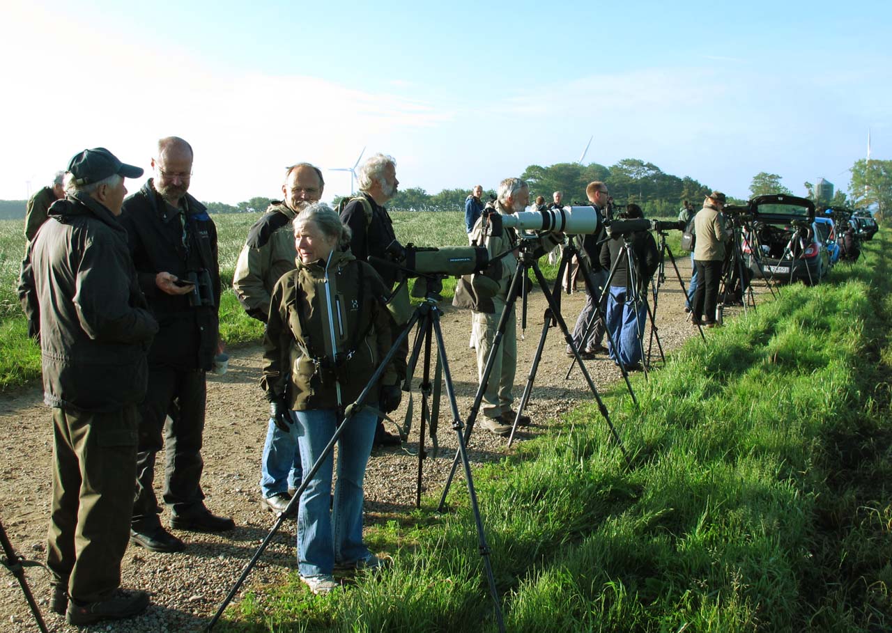 Beskrivelse: op mod 100 fuglekiggere ser på gåsegrib, der har overnattet i toppen af et udgået træ. Først kl. 10. lettede den