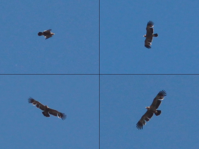 "Jag delar fullt din mening att det rör sig om en 2K stäppörn, en individ som saknar det ljusa vingbandet undertill. Trots att bilderna inte är de bästa ser man att t.ex. huvudet och buken inte är ljusare än bröstet, vilket borde ses hos en kejsarörn i motsvarande läge o ljus, även om man inte kan urskilja streckningen på bröst o vingtäckare. Annars kan de två arterna te sig rätt lika varann i svåra ljusförhållanden och i situationer där man inte kan urskilja dräktdetaljer.