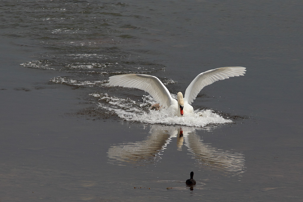 Beskrivelse: Uvist af hvilken årsag tog fanden pludselig ved Knopsvanen. Den buldrede for fuld damp ned mod den sagesløse Blishøne, som dog ikke fortrak en mine. Der var ingen andre svømmefugle i Knopsvanens angrebsretning.