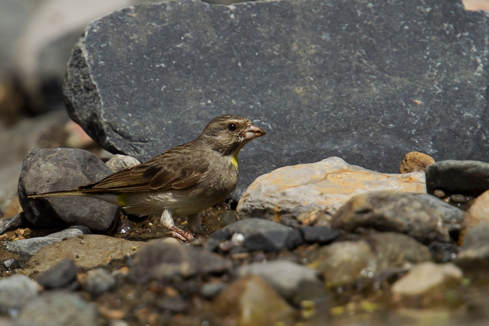 Beskrivelse: Endemisk for Etiopien. En sjælden og indtil for nylig nærmest ukendt art. Blev først beskrevet fra 2 lokaliteter i Etiopien i 1880, 1885 og 1886 og derefter ikke set indtil den blev genfundet ved Melka Ghebdu i 1989. Den er på det seneste fundet på flere lokaliteter, men artens samlede udbredelse er fortsat lille og Birdlife betegner stadig arten som "endangered". Jeg oploader dokumentationsfotos af 3 forskellige individer, for at vise artens individuelle variation. Jeg har tidlige korresponderet med Uffe Gjøl Sørensen om denne art. Han havde, som altid, interessante betragtninger, bl.a. at arten måske varierer, enten individuelt eller geografisk, dvs fuglene fra Melka Ghebdu måske var lidt anderledes and fuglene på andre lokaliteter. Jeg tror nu (er ikke sikker) variationen er individuel, måske afhængig af alder. Den gule strube varierer fra kraftig gul til lys uden synligt gult. Jeg har hidtil forgæves prøvet af få billeder af flere individer. Men arten er ret vanskelig at få rimelige billeder af... På denne tur lykkedes det af få billeder af min 6 forskellige individer. Jeg brugte næsten en hel dag, delvist i skjul i et krat, ved den lille biflod (til Melka Ghebdu) der krydser vejen 19 km efter Ankober kirke. Fra solopgang til ud på eftermiddagen kom der jævnligt små grupper på 2-4 fugle + enkelt individer for at drikke, præcis det samme sted; ca 100 m oppe ad bifloden, lige der hvor jeg ved tidligere besøg også har set arten! ca 10 gange lykkedes det at nærstudere fuglene gennem længere tid. De fleste individer havde begrænset, men ret tydelig gul strube (mindre end afbilledet i field guiden "Birds of the Horn of Africa), 2 havde meget tydelig gul strube og min 2 manglede tilsyneladende helt gult. Hvor mange forskellige individer jeg reelt så er umuligt at sige, men absolut min er 8. Det mest sandsynlige er 12. IN ENGLISH: These 3 pictures shows the individual variation of Yellow-throated Seedeater. Some birds have obvious yellow throat, while others apparently have pale throat with no yellow at all.