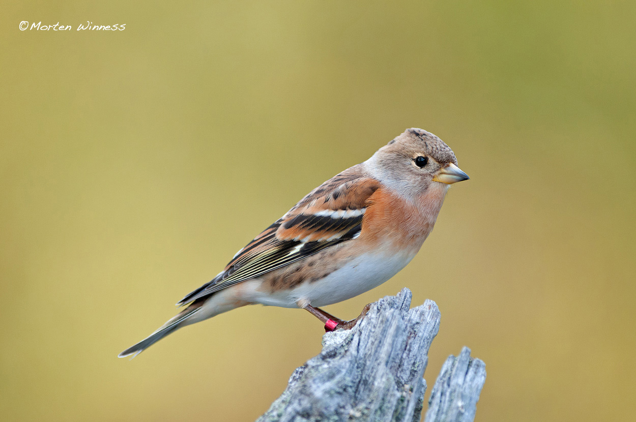 Beskrivelse: Denne fuglen er merket med en burfuglring, noe vi ser fra tid til annen. I noen europeiske land (Belgia, Tyskland, Nederland som regel) er det utbredt hold av finkefugler i bur. De har visstnok en litt annen lovgivning rundt dette enn vi har. Fuglen er en 2K+ hunn, og har nok hatt et opphold bak seg som burfugl. Trolig slippes en del av disse løs med vilje. I Norge får vi 3-4 rapporter i snitt pr. år om slike fugler. Vanligvis er det alltid bogfinke, kvækerfinke eller grønsisken.