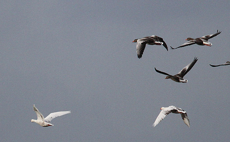 Beskrivelse: To leucistiske Grågæs i flok af alm. farvede Grågæs.