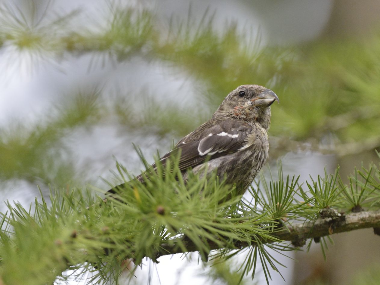 Beskrivelse: En tillidsfuld ungfugl, ivrigt furagerende. Enkelte trompeterede kald, som blev besvaret af andre hvidvingede korsnæb. Begyndende røde fjer ses på issen.