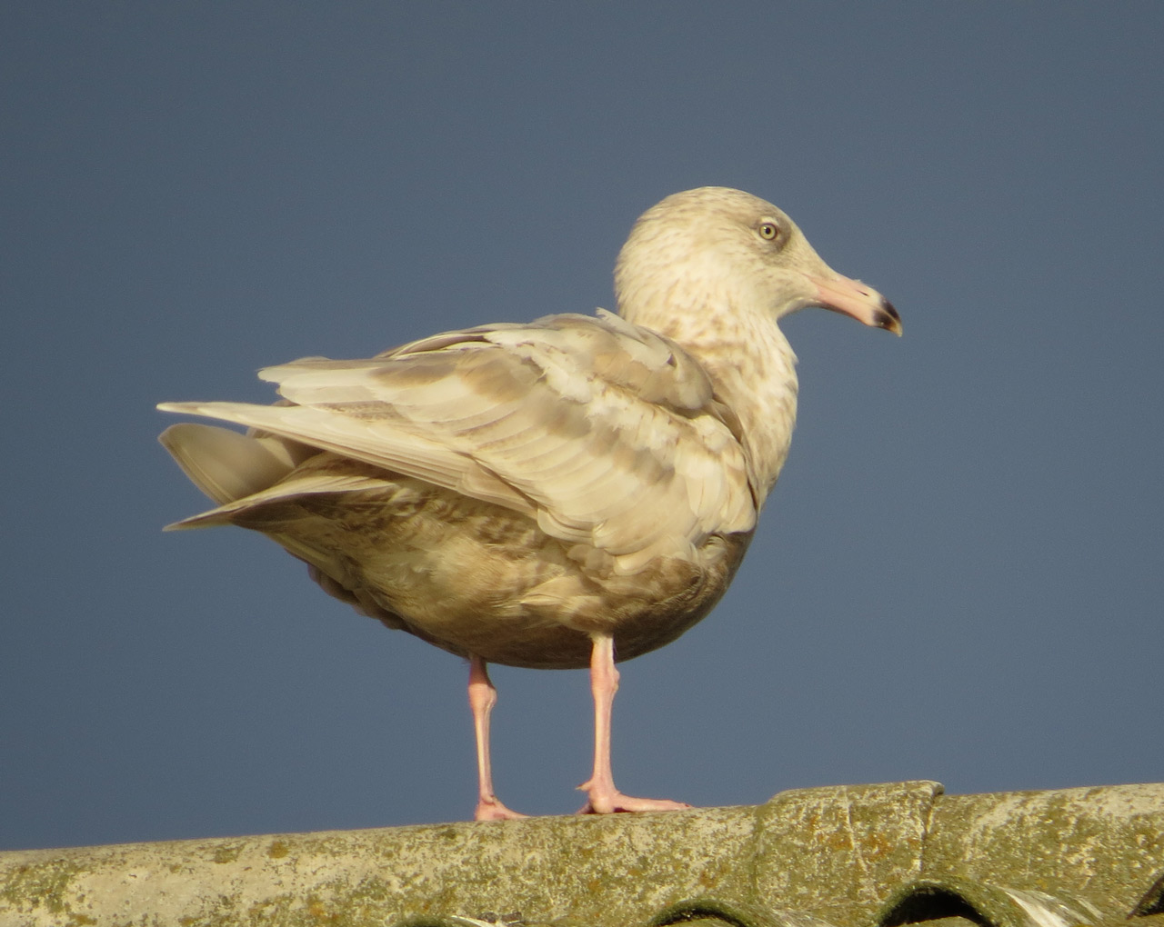 Beskrivelse: Jeg hælder mest til at dette er en gråmåge - stemmen var iøvrigt pivende som hørt hos andre gråmåger. Det er nok vinge- og skulderfjer, der fik mig i tvivl om der kunne være tale om en hybrid - jeg har andre billeder, men da fuglen blev stående på taget, er de fra samme vinkel.