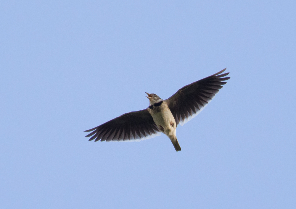 Beskrivelse: Kalanderlærke i flugt er en tung sag ! Tyngde, i kombination med en "gøp" af et næb, de mørke undervinger, og den hvide vingebagkant gør bestemmelsen meget let...