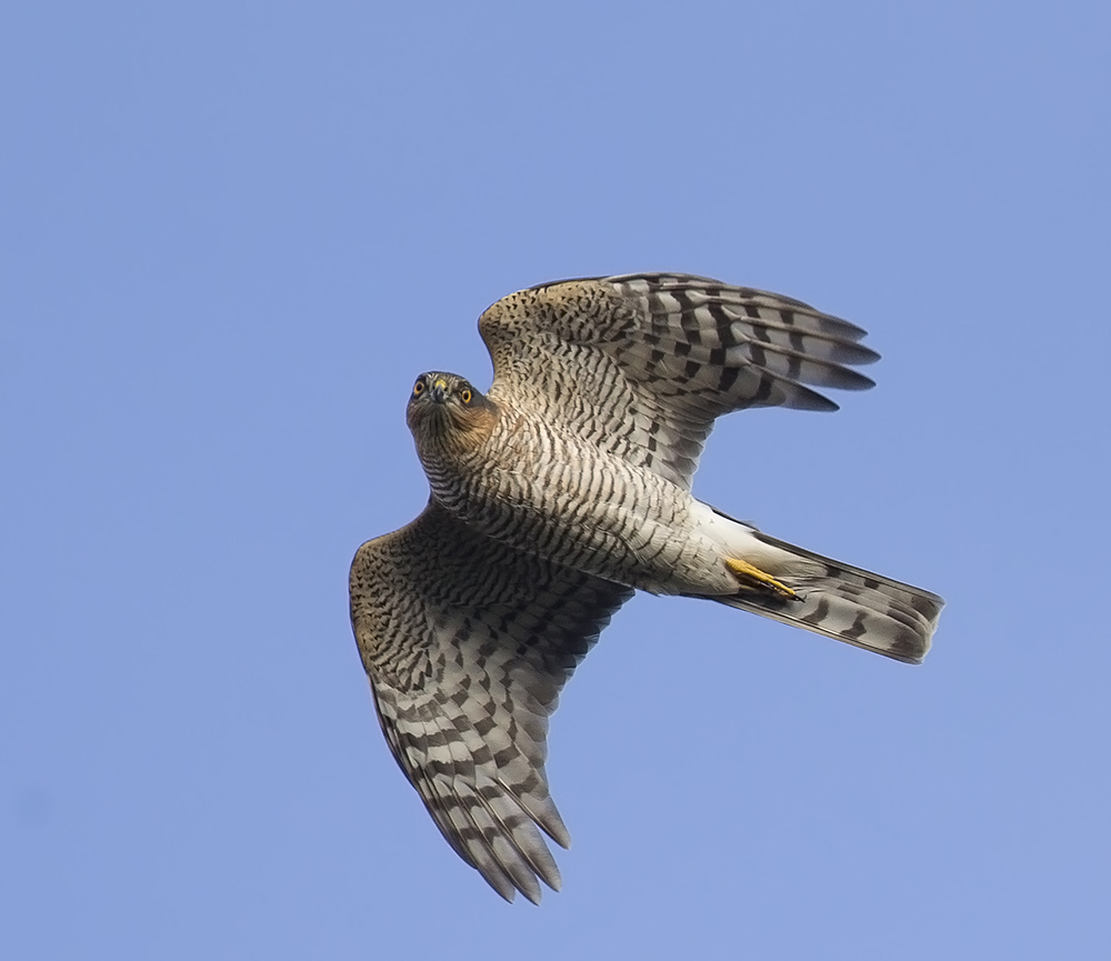 En typisk gammel hun. Svagt defineret, eller knap synlig øjenbrynsstribe, rusttonede kinder og strube med tydelige sorte skaftstriber, mere skarpt tegnede, og mørkere tværstriber på undersiden (end hos ad. han), og iris varmt gul, mindre orange(end ad. han)