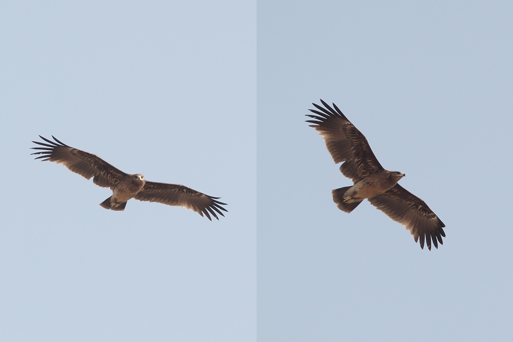 Det kunne for mig at se også ligne en steppeørn med den smilende mundvig og båndede svingfjer, men undervinge tegningerne passer alligevel ikke helt med de mørkere dækfjer...min erfaring med arterne begrænser sig til et enkelt besøg i Israel så jeg skal på ingen måde komme med en dom. Måske forekommer steppe slet ikke i Dubai?