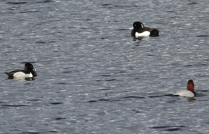 Beskrivelse: Halsbåndstroldand i fuld sol. Her fremstår flankernes dunkeltgrå farve mindre tydeligt end i dårligt lys og overskyet, hvor kontrasten mellem den hvide lodrette felt på forflanken og resten af flankernes grå farve er tydelig. I medlys - som her - er fuglens påfaldende hvide tegninger omkring og på næbbet så meget mere iøjnefaldende end flankerne. Fuglens form er i øvrigt afslørende med meget stort hoved med højeste punkt kuriøst langt bagtil og koket strittende hale - det store hoved har meget fyldige basunkinder ala trumpetisten Dizzy Gillespie.