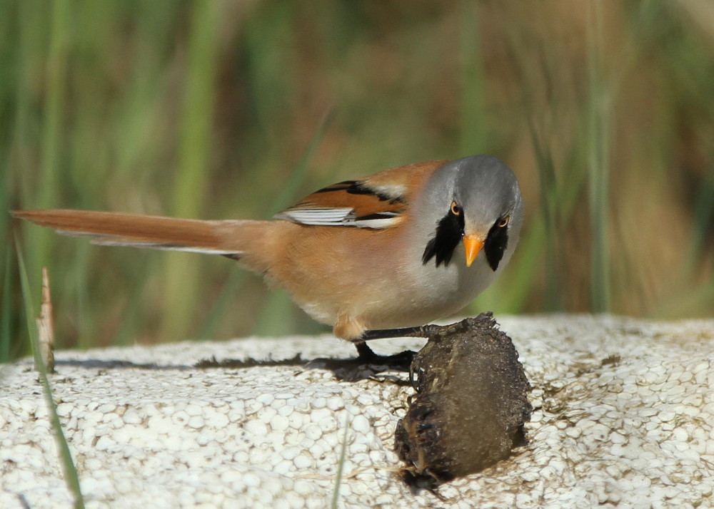 Beskrivelse: Skægmejser er ikke min spidskompetence, så efter rigtig mange ihærdige forsøg lykkedes det i dag at komme tæt på. Først landede den i en akrobatisk split i rørene, inden den fandt en interessant udefinerlig brun masse på en stykke flamingo mellem rørene. Uglegylp, måske?