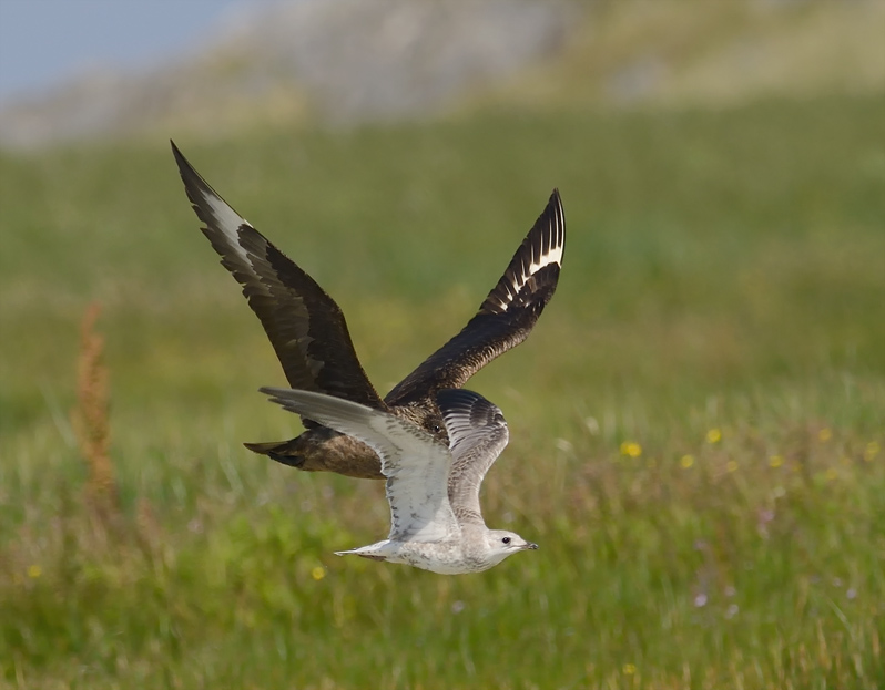 Beskrivelse: Storkjoven jager en ung Stormmåge som bytte.