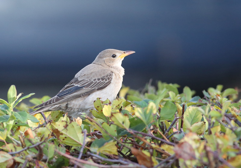 Beskrivelse: Denne unge Rosenstær blev en slags signaturfugl for første del af Felttræf 2014. Den kunne bl.a. - som her - ses på få meters afstand fouragerende i en rosenhæk ved Spar-købmanden i Blåvand by, tilsyneladende stort set ugeneret af de mange turister af dansk og germansk herkomst. Den sandfarvede grundtone ses, ligesom de stærkt kontrasterende mørkere vinger med er komplet sæt juvenile dækfjer. Det stirrende peberkornsøje anes, ligesom "drosselnæbbet", der tit er rosatonet ved basis og klarest gult på undernæbbet. De fleste felthåndbøger viser et mere ensartet gult næb.