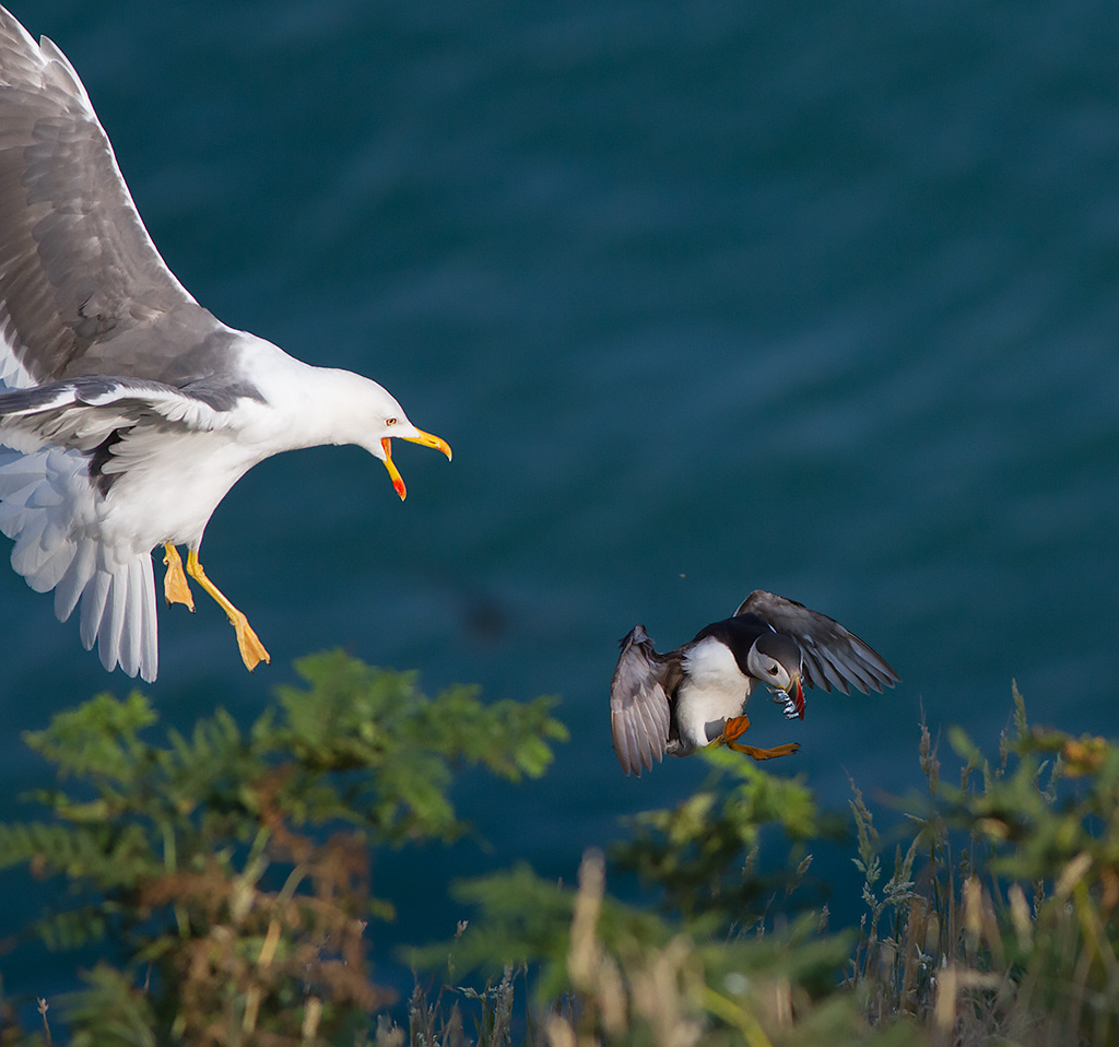 Beskrivelse: Lunderne flyver spidsrod mellem røveriske Sildemåger på vejen ind til deres redehuller med tobis til ungen.