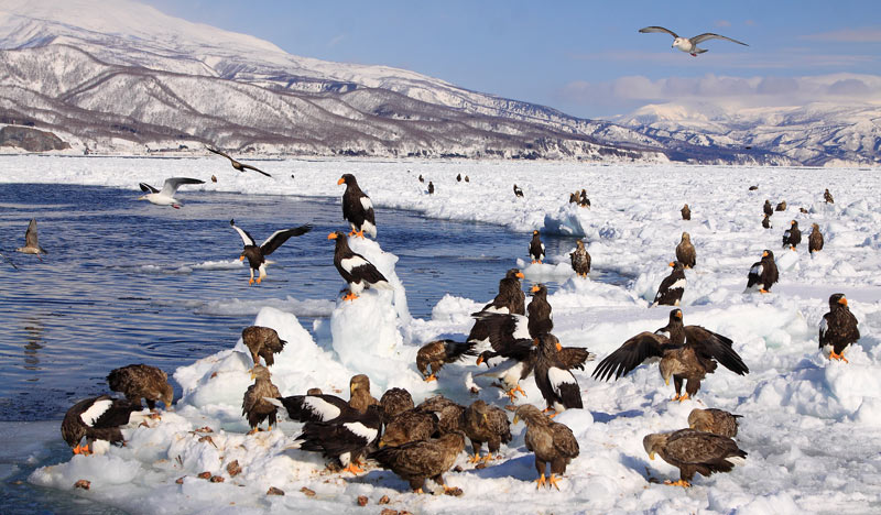 Beskrivelse: Billedet tag fra båd der sejler ud fra Rausu. Fra båden kunne Jan Eske Smidt og jeg tælle ca.150 Beringshavørne og 100 Havørne på et område med radius på 1000m omkring båden.