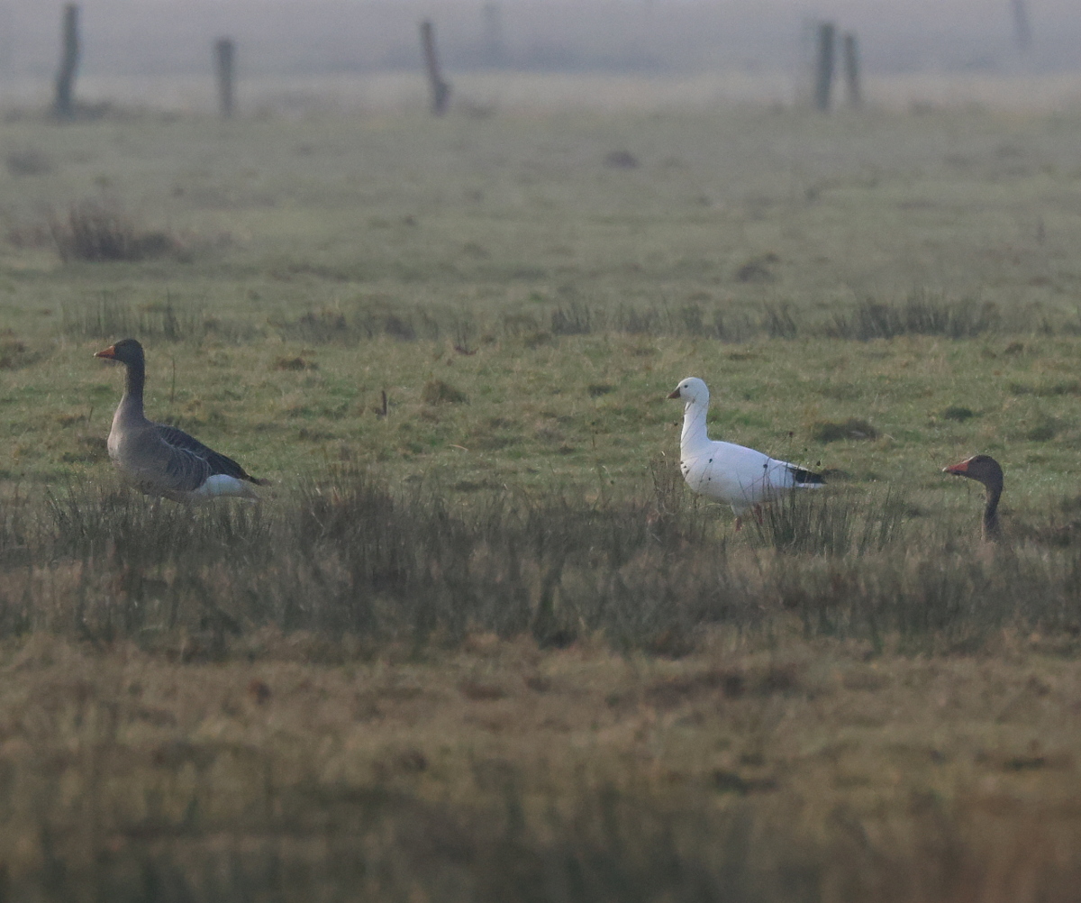 Vi stoppede ved en tilfældig gåseflok efter at have forladt motorvejen. Jeg kiggede ud og meldte tre hvide fugle. De gik med hovederne nede og da de var meget små i forhold til Grågæssene, var min første tanke, at det var hvide tamænder. <a target='_blank' href=' http://www.netfugl.dk/profiles.php?id=showprofile&profile_id=1900'>PAC</a> så først hovedet på dem og sagde derefter ”Ross Geese”. Det blev fuglene lidt mere spændende af og PAC fik lige spurgt til artens status i DK. Jeg tog nogle hurtige billeder og vi hoppede ud af bilen for at se dem i teleskop. I teleskopet afsløredes det hurtigt, at de alle var mærket med blå farveringe. <a target='_blank' href=' http://www.netfugl.dk/profiles.php?id=showprofile&profile_id=4512'>Julien Mazenauer</a> mente at kunne erindre, at 3 undslupne Ross Geese var set på Texel, så det var nok ikke værd at sætte sin lid til, at der var et blåringsprojekt af denne art i US. Fuglene lettede hurtigt efter, at vi kom ud af bilen. De blev set fra Marsk Stigs Vej. De var ikke så "blånæbbede" som arten kan være, men der kunne ses en blålig toning på den inderste del af næbbet.