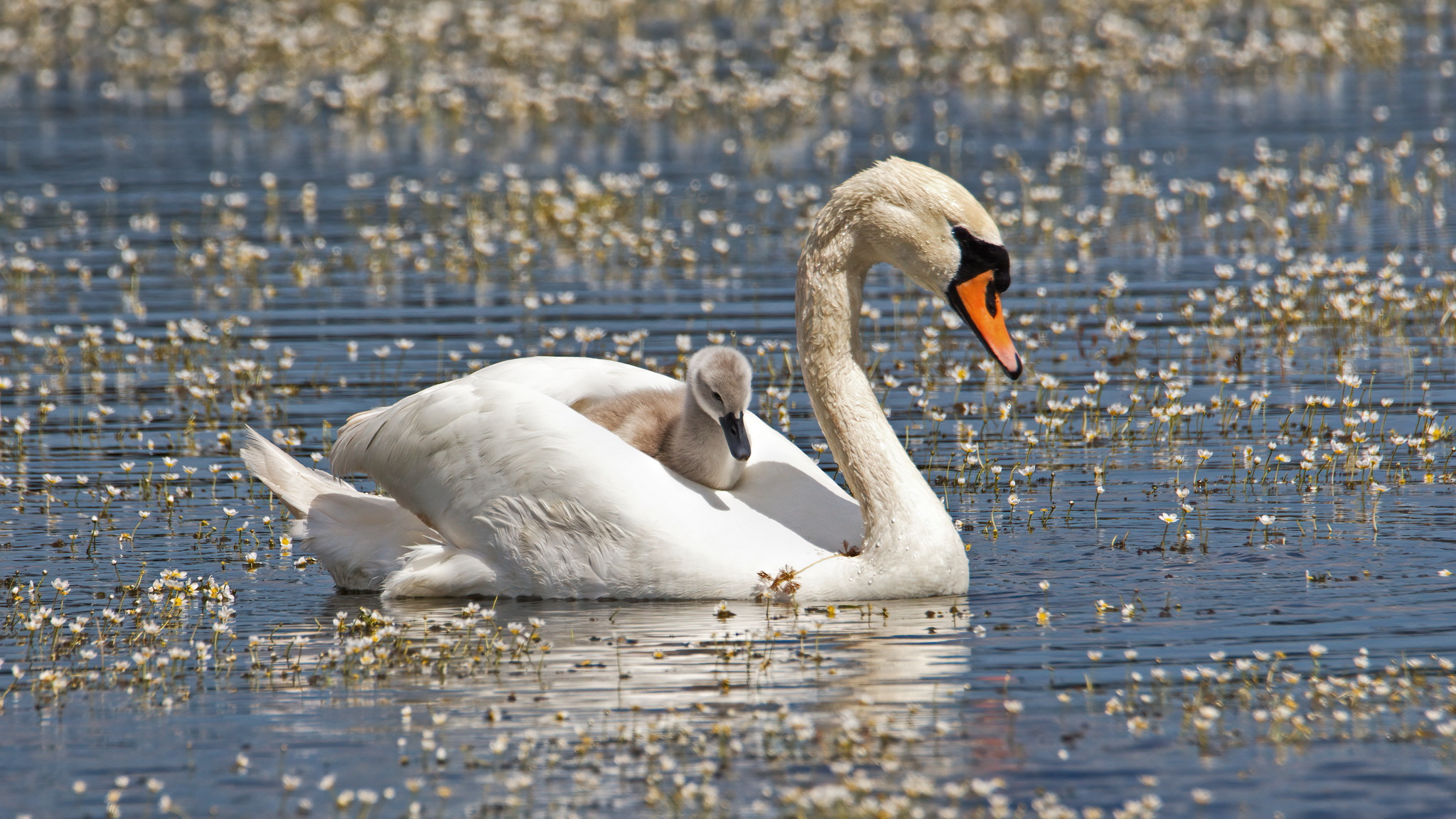 Beskrivelse: Et par Knopsvaner med fire unger kom vraltene over engen samtidigt med at en flok køer nærmede sig. Da køerne kom tæt på, gik Svaneparret i forsvars position, og pustede sig op, for at forsvare ungerne - det viste sig at blive skæbnesvangert !