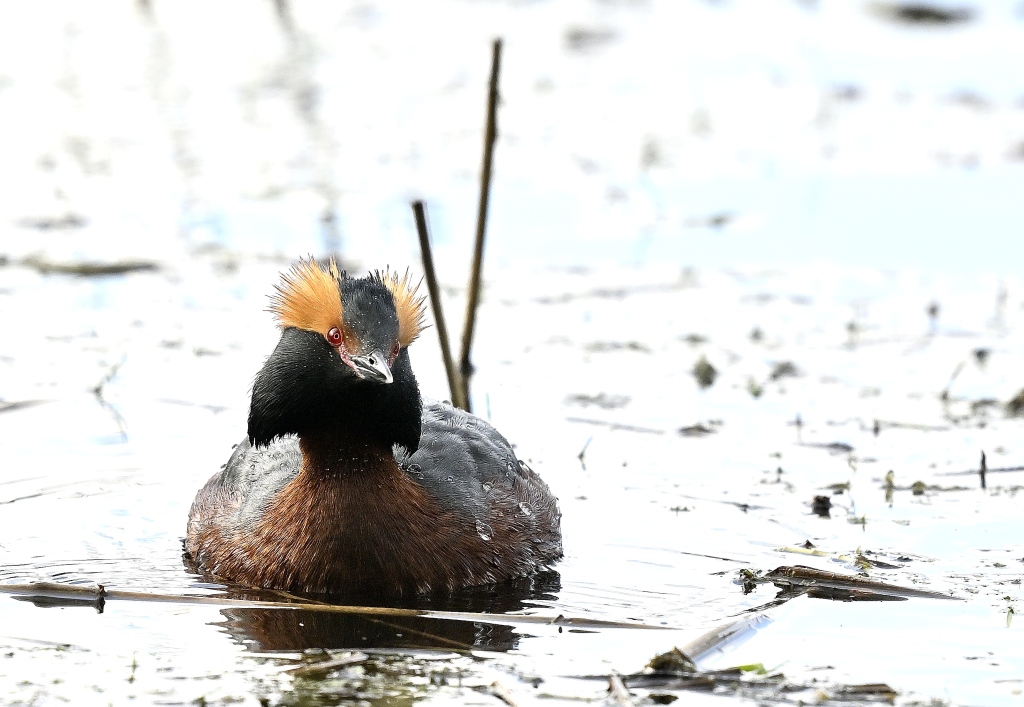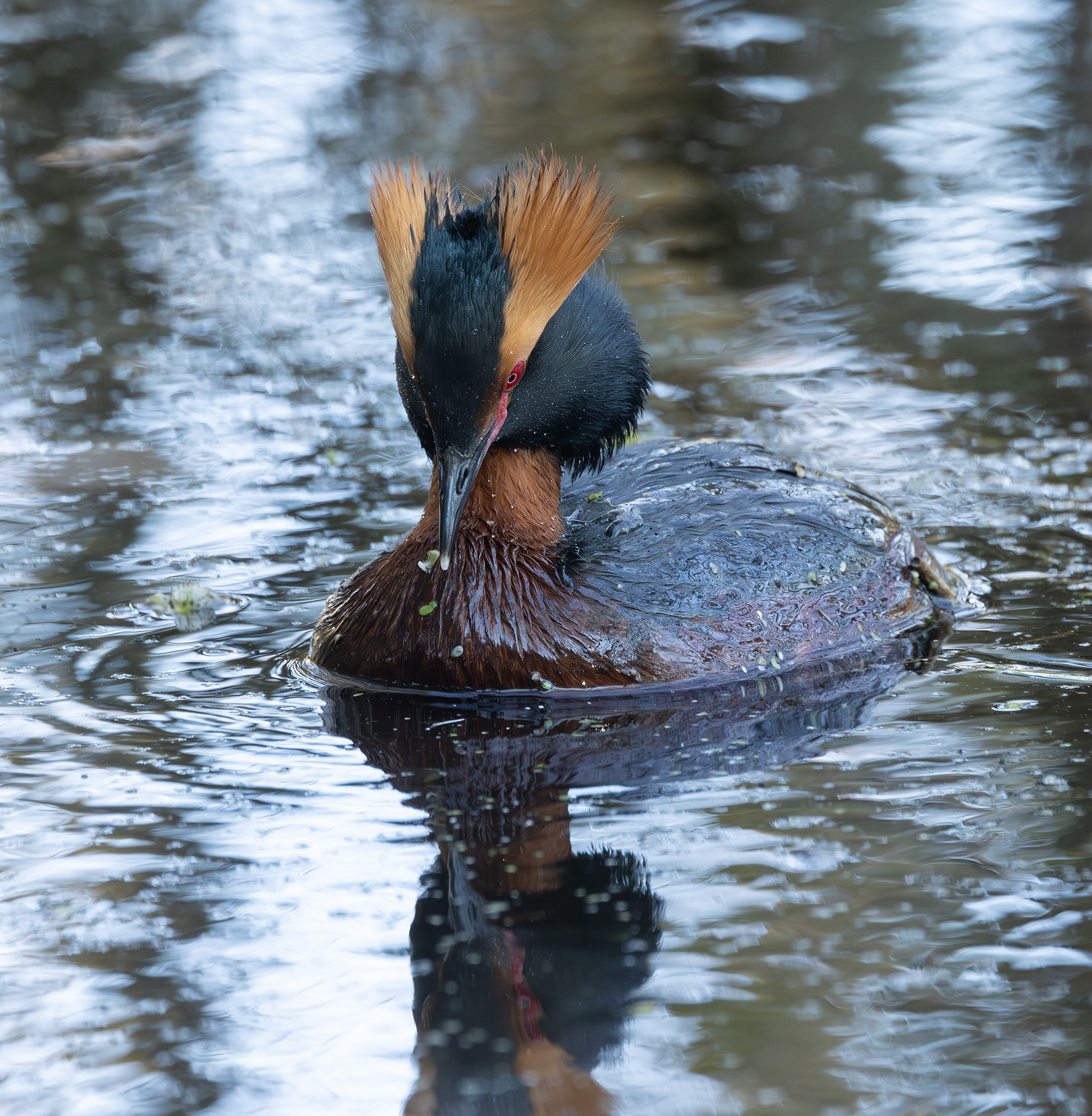 Beskrivelse: Nordisk Lappedykker,han i gang med dens vandgymnastik. I selve Kyrktjärn ynglede der 3-4 par Nordiske Lappedykkere, som gjorde pladsen trang , sådan at andre par ynglede udenfor søen. Denne han ynglede slet ikke, selv om den var i et parforhold , og dette kunne ses på begge fugle, som stadig var i fuld yngledragt. Hvorimod hos områdets andre individer var fjerdragten begyndt at falme kraftigt, så deres guldører / ananasstykker kunne næsten ikke ses mere.