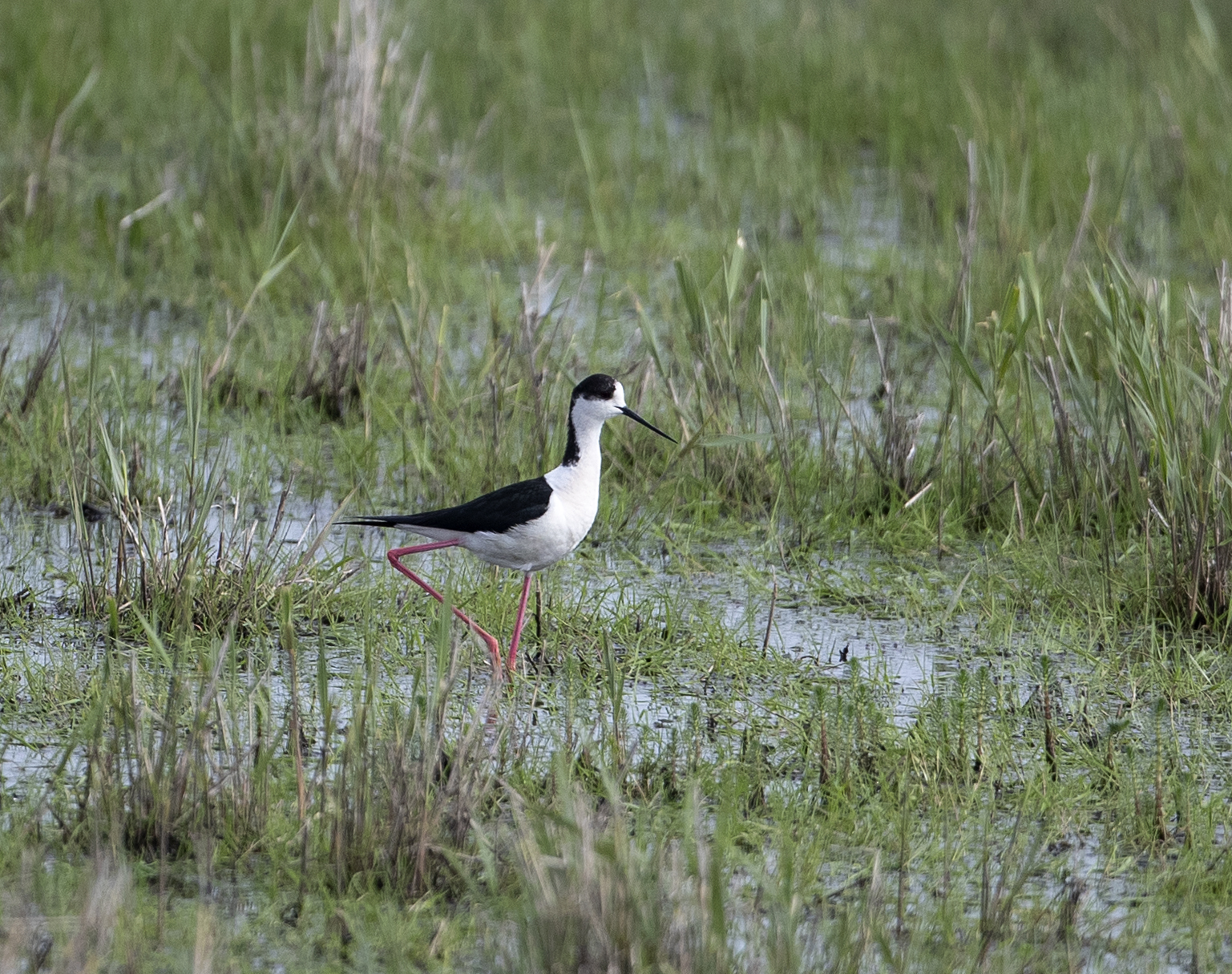 Beskrivelse: To af de i hvert fald op til fire stylteløbere, der i en længere periode blev set i Margrethe Kog og tyske Rickelsbüll Koog. Fuglene var i området i perioden 13.05-10.06. Udover de to afbillede fugle var der en hun og en sortnakket han i området. Foto taget med mobil gennem teleskop.