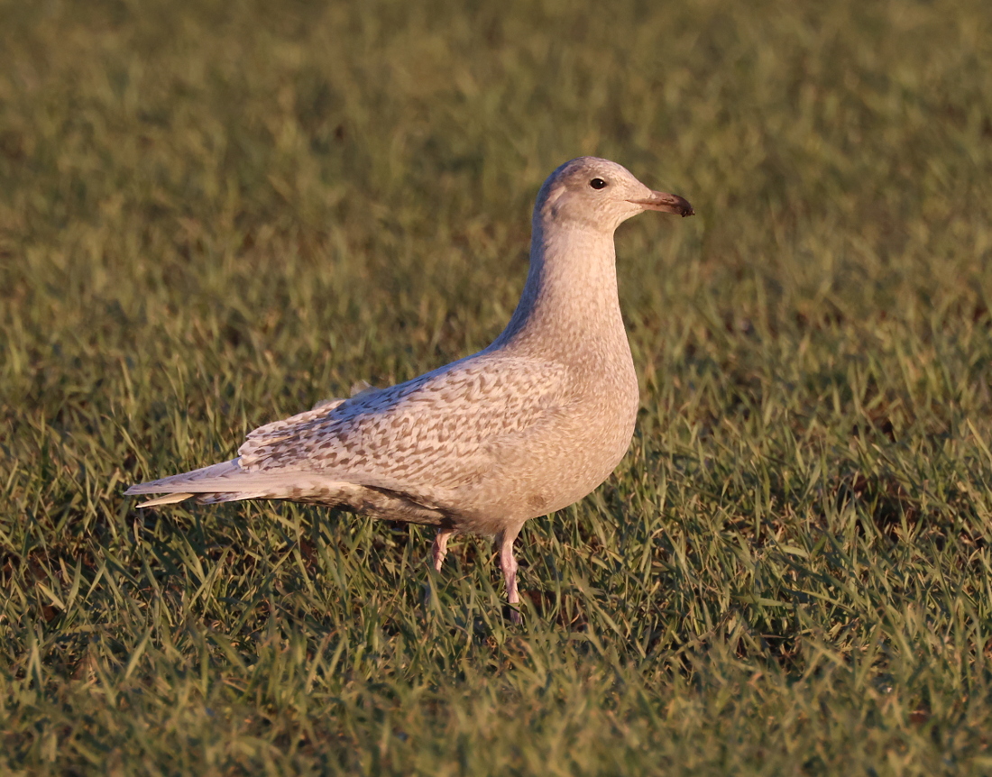 Beskrivelse: Hvidvinget Måge i 3. vinterdragt. Læg mærke til den fine grå, men ret skarpt afsatte tegning på yderfanen af yderste håndsvingfjer. Havde fuglen været fuldt adult havde dette været kendetegn for "kumlieni", som kan regnes som en overgangsform/hybridsværm mellem Thayers Måge (vist kaldet Iniutmåge af DOF). Tilsyneladende kan udflydende mørke tegninger i håndsvingfjerene ses hos en del immature Hvidvinget, men det er dog ikke endeligt afklaret om, hvorvidt disse fugle med mørke tegninger i hånden stammer fra Grønland(hvor Hvidvinget Måge, glaucoides yngler) eller hos fugle, hvis oprindelsesområde ligger længere vestpå, i arktisk Canada. Eftersom ren Hvidvinget som adult og juvenil bør mangle mørke vel afgrænsede tegninger i vingespidsen, kan denne fugl godt nævnes som mulig "kunmlieni" - den mørke tegning i yderste håndsvingfjer er definerende for "kulieni" i adult dragt.