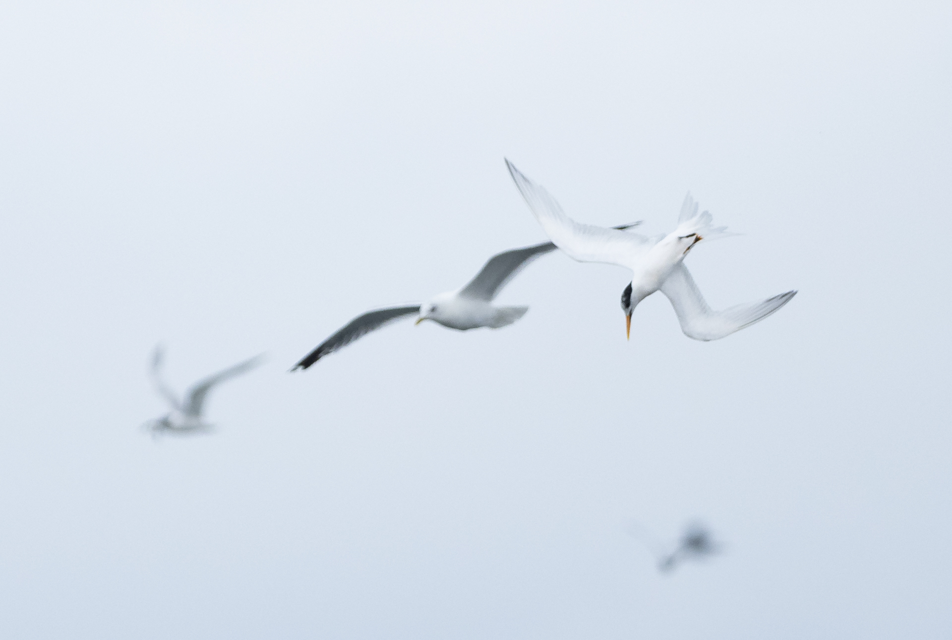 Beskrivelse: Jeg var ikke klar over at jeg fotograferede den omdiskuterede fugl. Der var gang i et sandt "feeding frenzy" af terner, måger, skarver og suler, og jeg fotograferede tilfældigt ind i flokkene. Jeg opdagede til min gru, at den gulnæbbede terne var på tre af mine fotos (opdaget to dage efter). Alle tre fotos er croppet kraftigt.