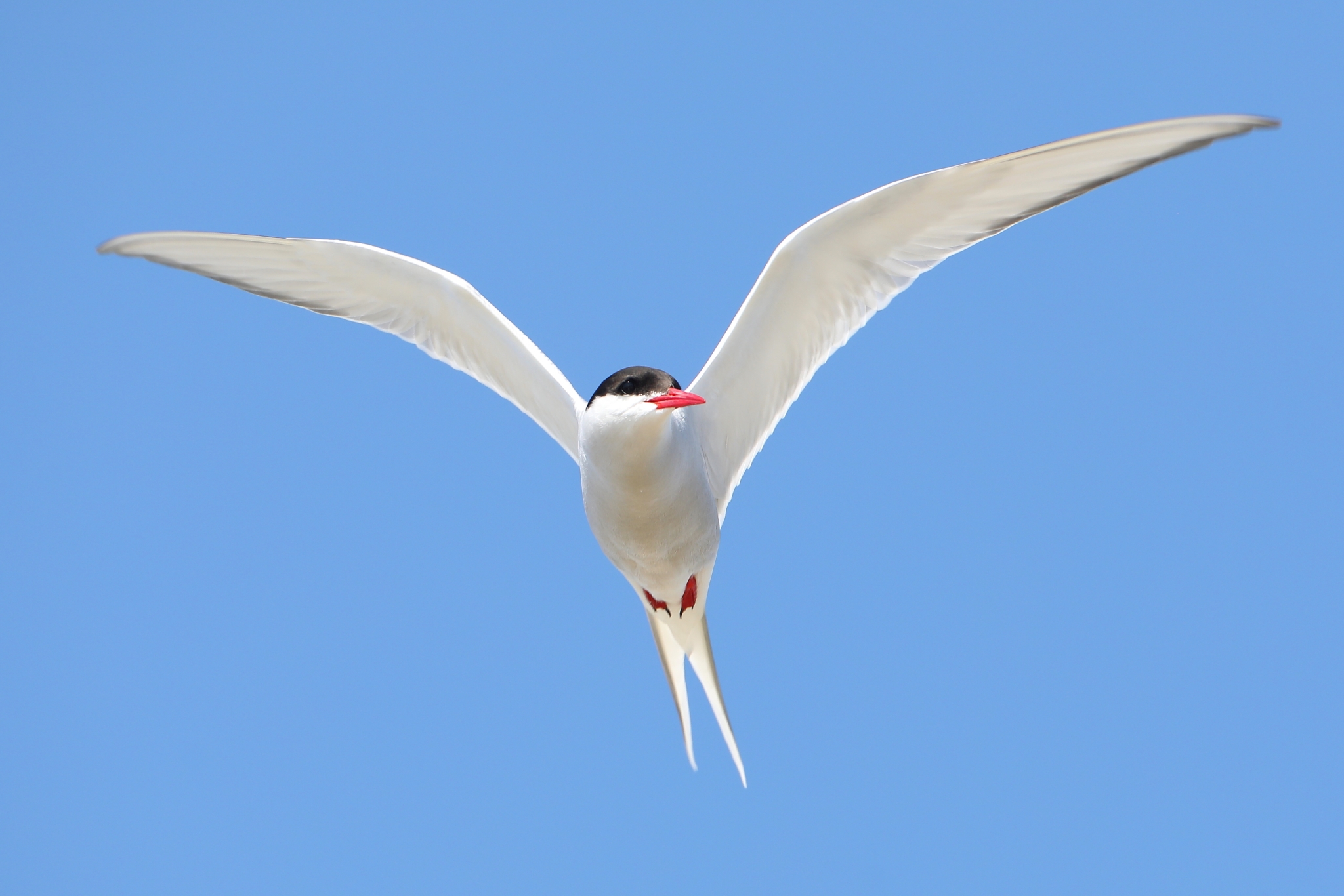 Fjordterne til venstre har længere næb med orangetonet inderdel af undernæbbet, længere ben samt lysere dækfjer i større kontrast til mørk vingeforkant, samt mørkere svingfjer.