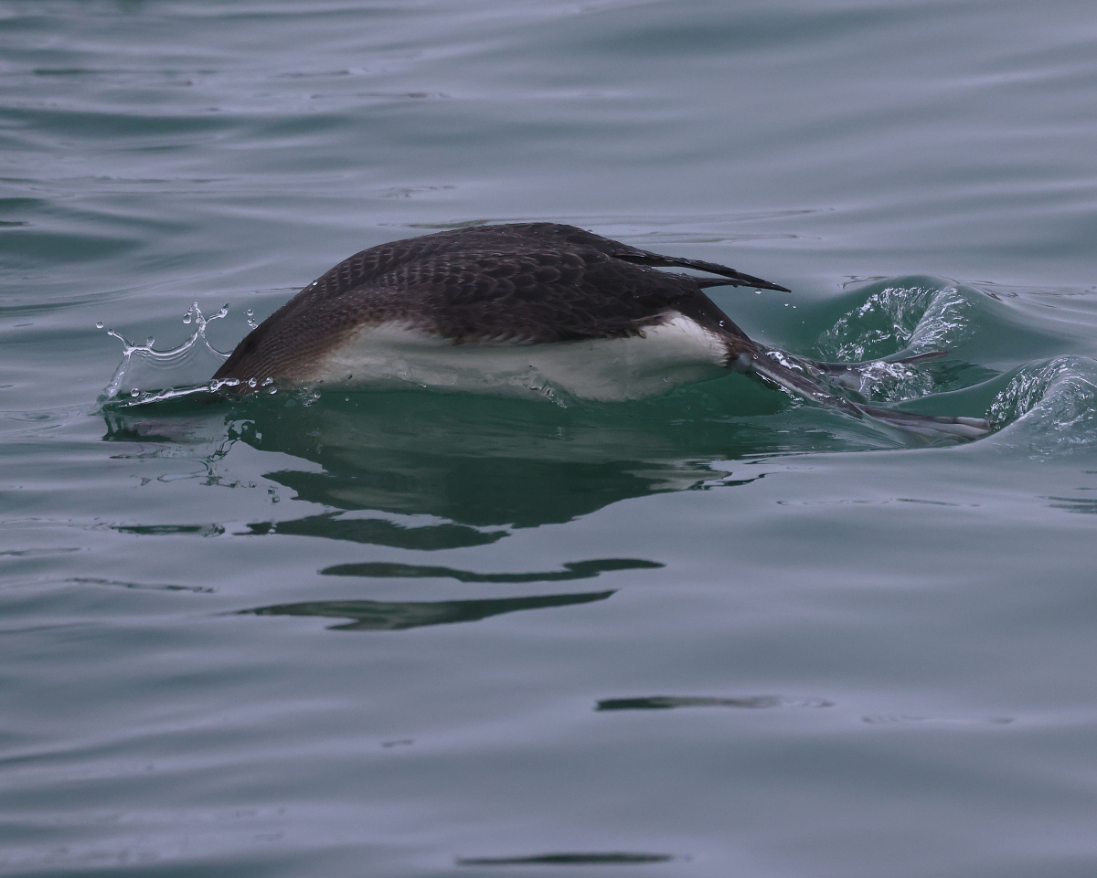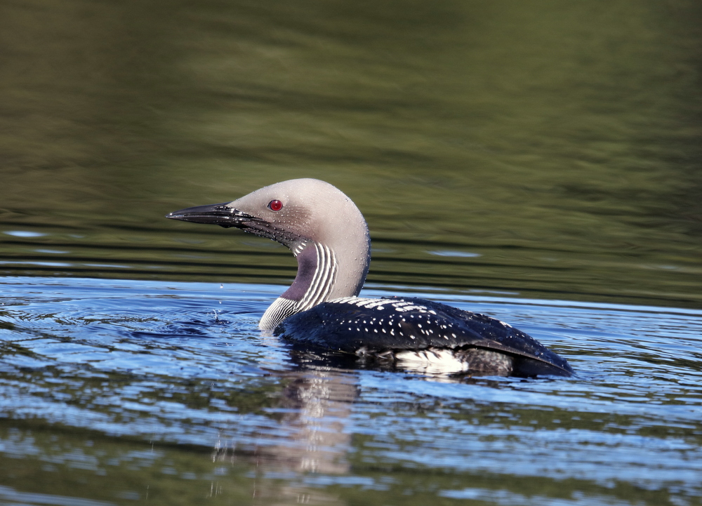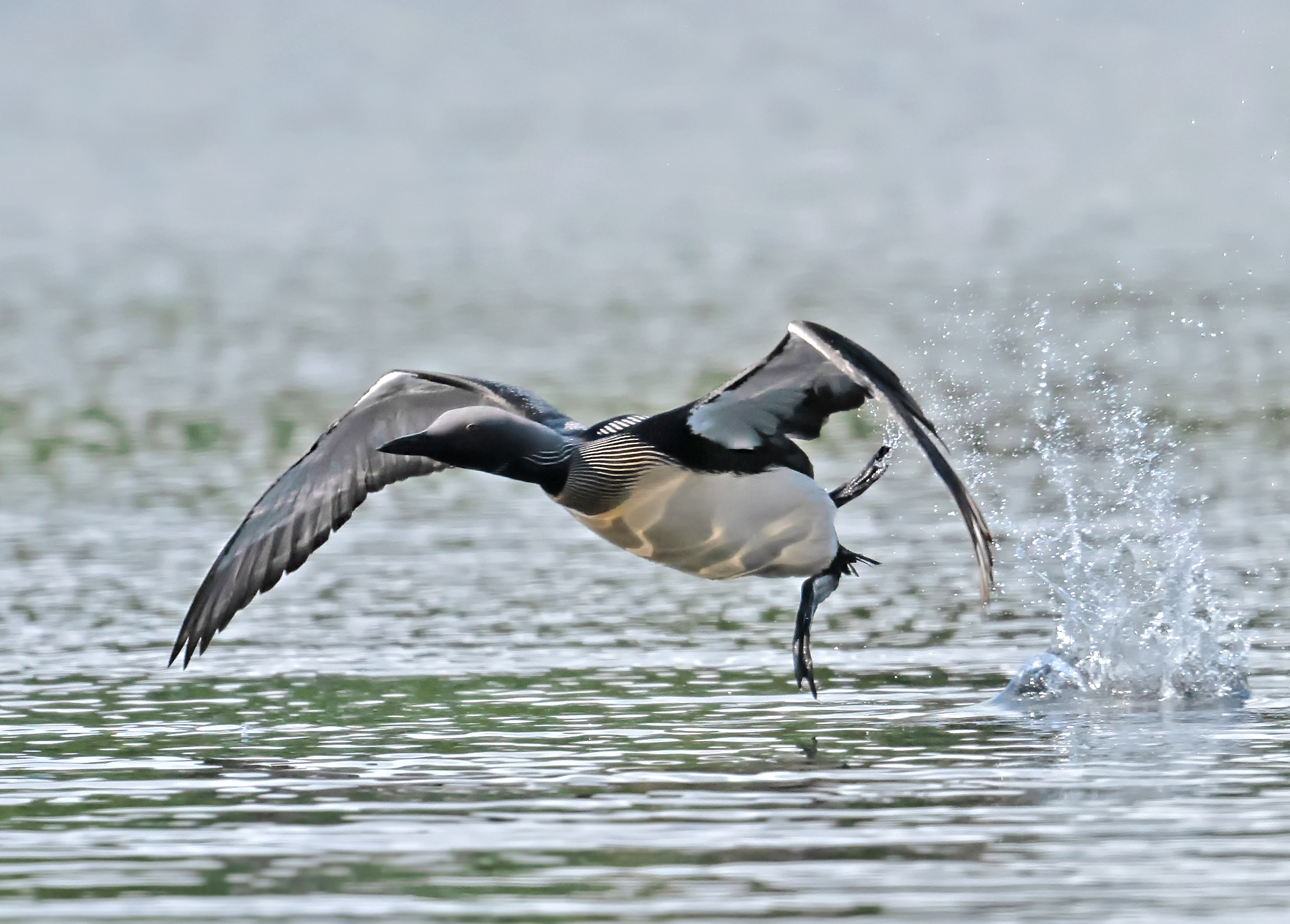 Beskrivelse: Efter det sociale morgentræf med andre af området Sortstrubede Lommer , prøvede denne Sortstrubet Lom , at flyve til områdets andre søer. Nu forstår jeg hvorfor lommer kun yngler ved store søer , nemlig pgra. det lange tilløb med