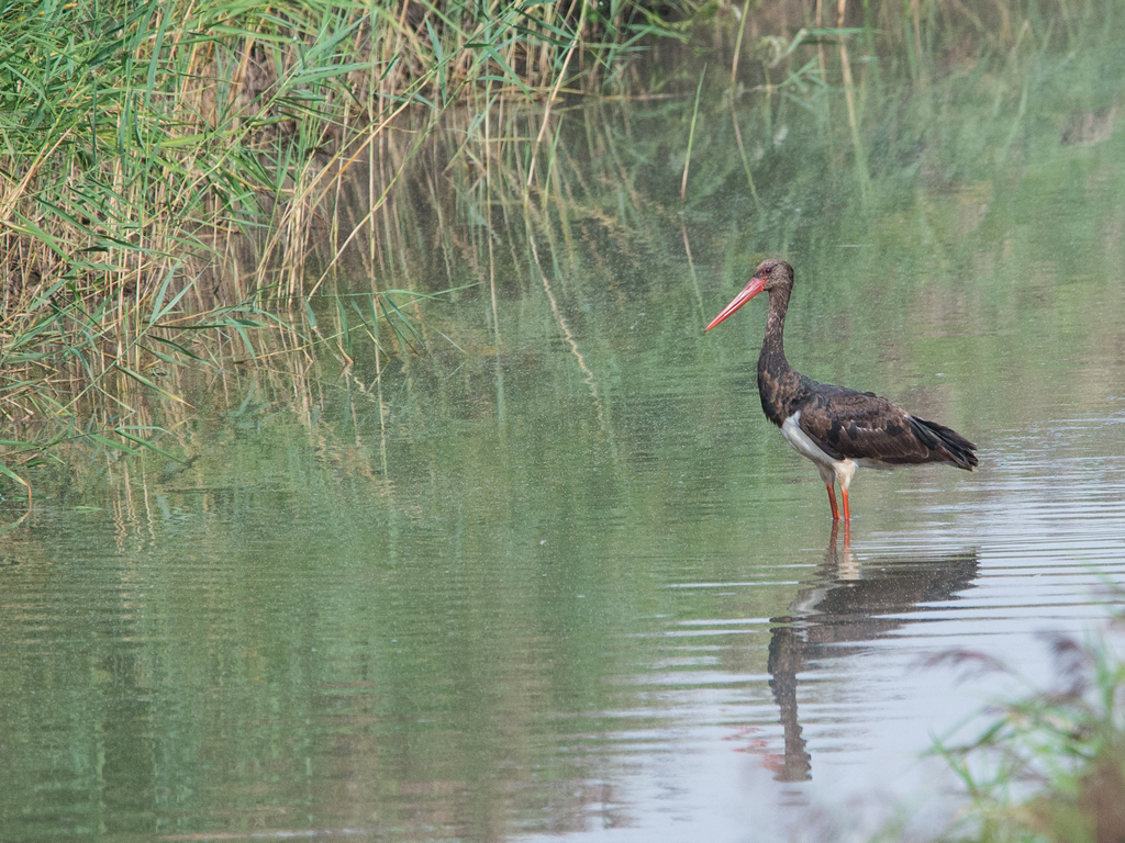 Beskrivelse: En tidlig morgen hvor frosten lå over hele Ekkodalen genfandt vi denne sorte stork som var set kort her aftenen forinden. Den var meget sky og lettede ved blot det mindste.