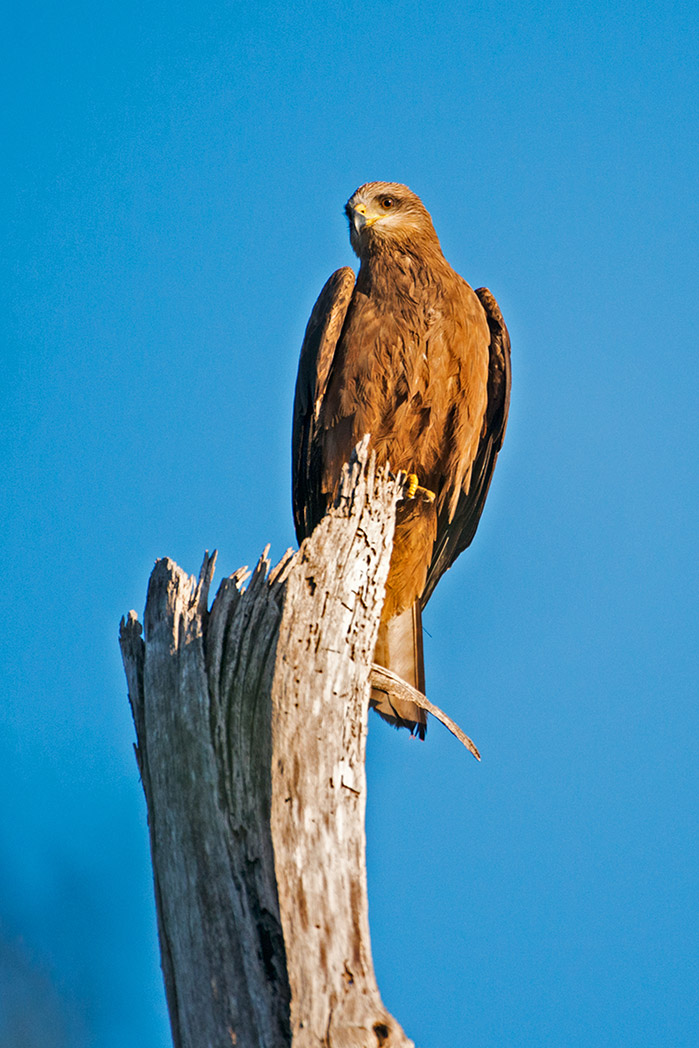 Adult Sort glente har desuden lyse øjne - både ung og gammel Yellow-billed Kite har brune øjne.