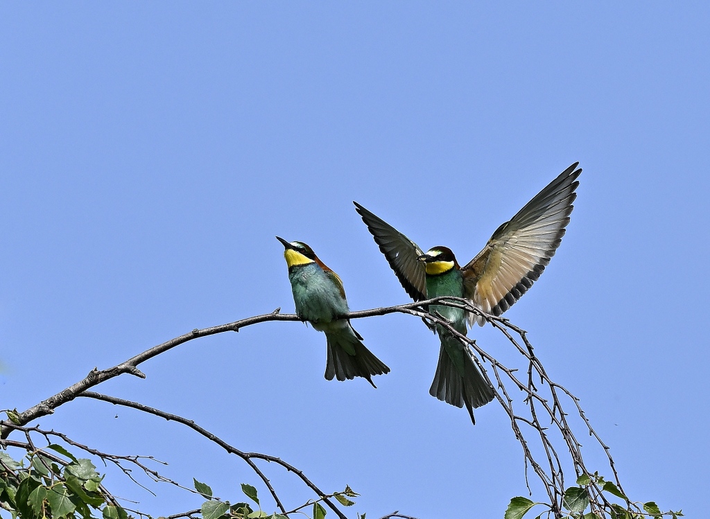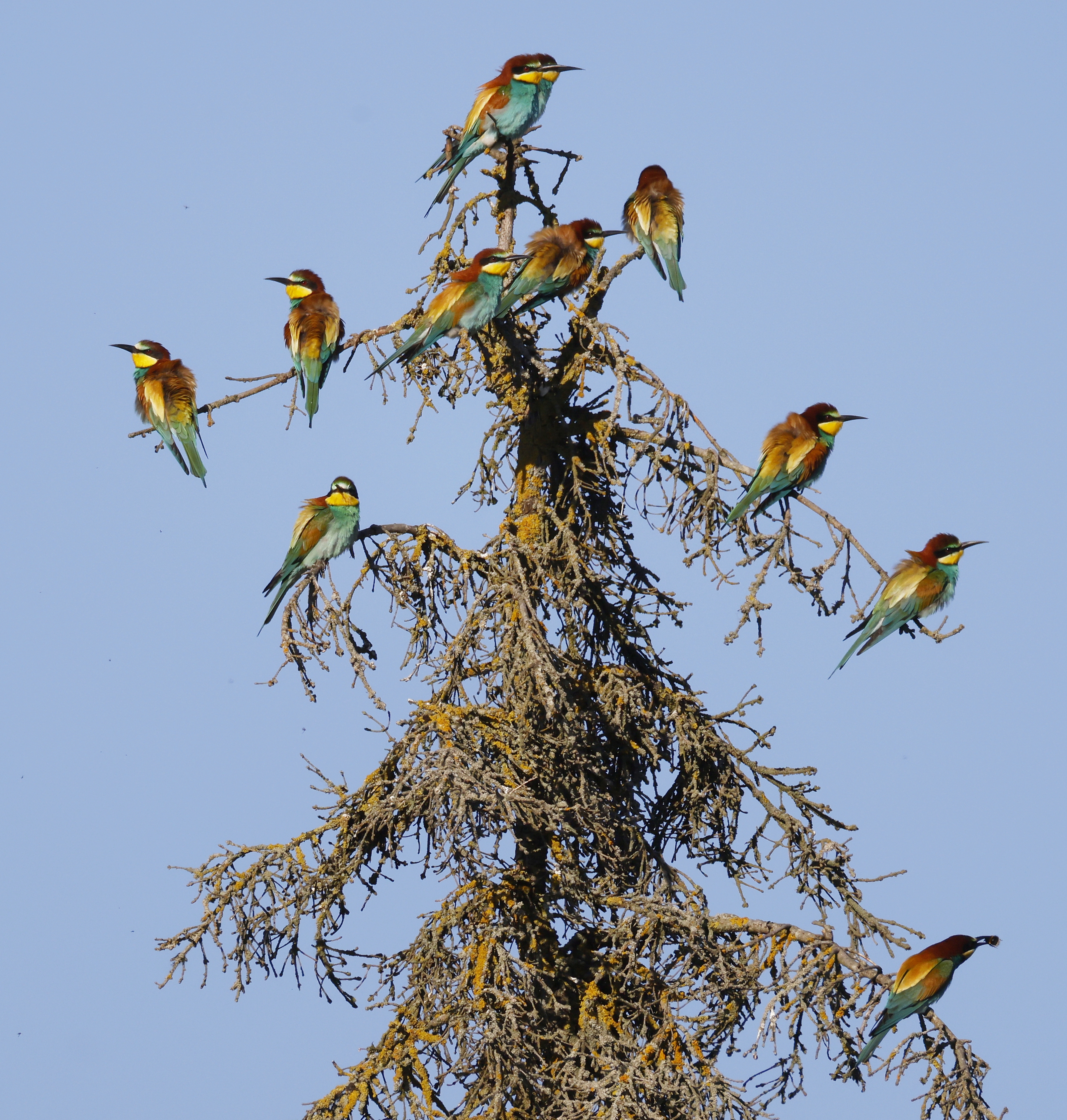 Beskrivelse: Fantastisk oplevelse. 12 biædere rastede i træer ved en mark, hvor de fouragerede før de gik til rast i en nabohave. På dette foto er der 11 biædere, som var det højeste antal, jeg fik på et foto