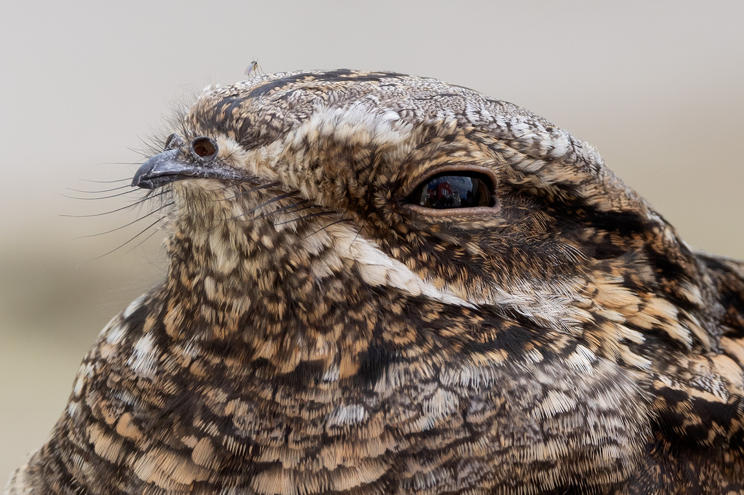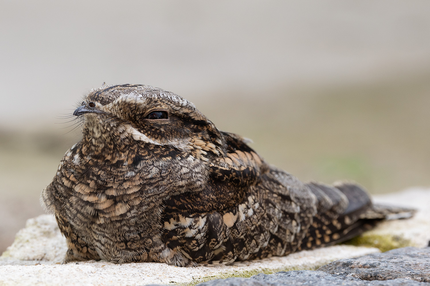 Beskrivelse: Natravnen havde slårt lejr på tærsklen til et mindre drivhus i en brostensbelagt gårdhave. Vel nok et lidt atypisk sted at tage sig en lur.