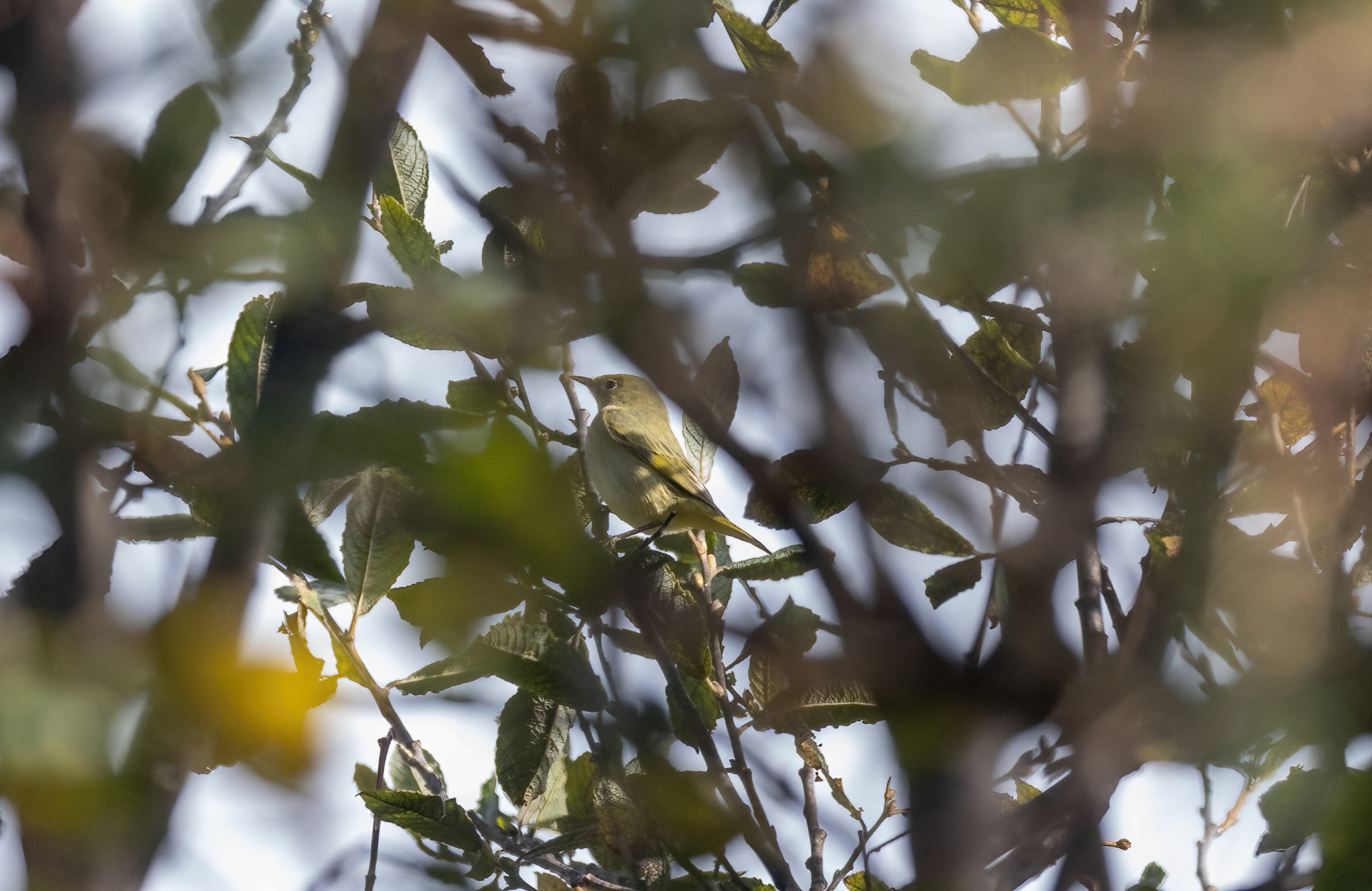 Beskrivelse: Det allerførste bare nogenlunde hæderlige foto af landets første gul sanger. Dens hurtige bevægeler mellem blade og grene,skifevis i sol og skygge gjorde det til noget af et job at hente et brugbart dokufoto hjem af fuglen. Billedet er taget ganske få min efter at fuglen er opdaget, men endnu ikke sikkert artsbestemt eller i øvrigt meldt ud. Meget kaotisk og sindsoprivende. Sidenhen blev fuglen mere samarbejdsvillig og langt bedre fotos er taget.