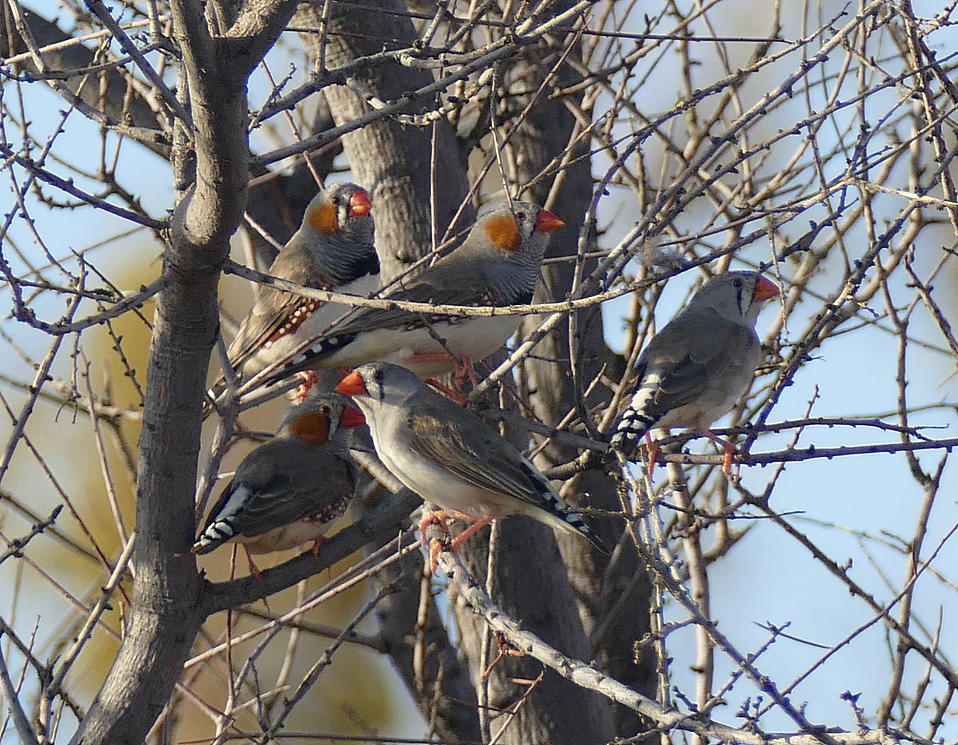 Titel: Autralian Zebra Finch - small flock roosting in tree. Zebra Finch has recently been split into Australian Zebra Finch and Sunda Zebra Finch.
